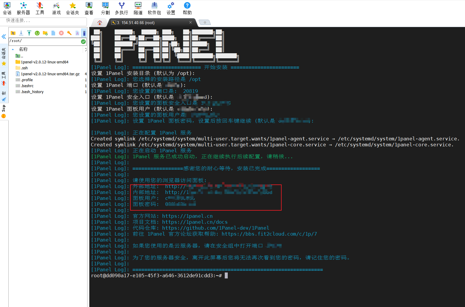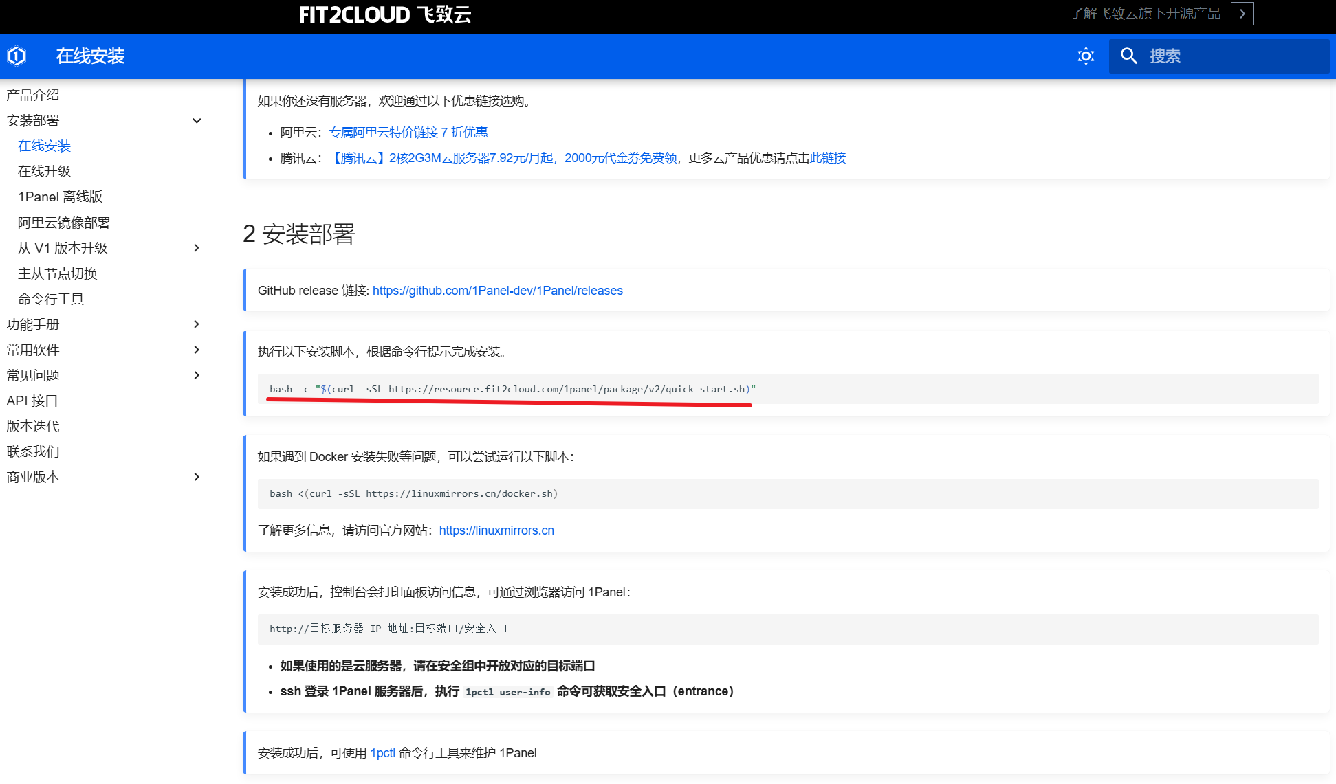 首先我们需要在我们的云服务器上安装1Panel,首先使用远程工具MobaXterm连接到云服务器,连接服务器后,我们打开1Panel官网的使用文档进行安装部署,讲安装命令复制到服务器命令行上。